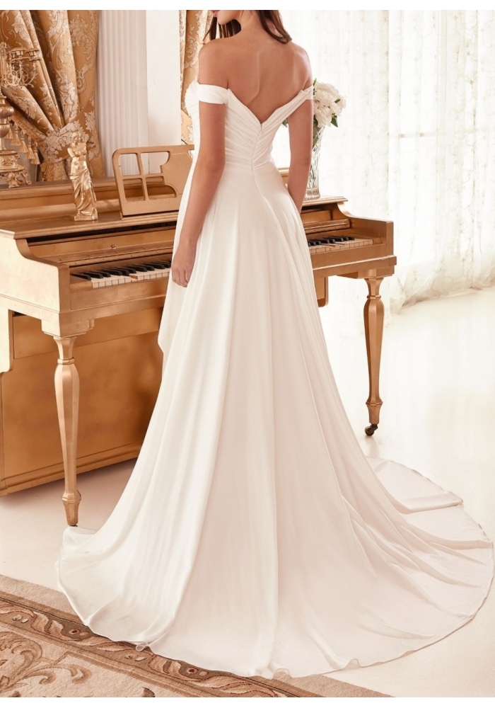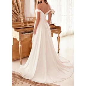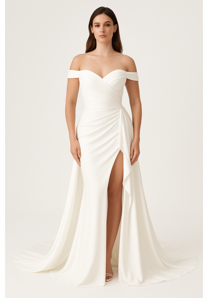 Elegant brudekjole med aftagelig skørt og slæb samt slids. Kjolen koster 4000kr + ekstra skørt 4000kr,- Leveres samlet.